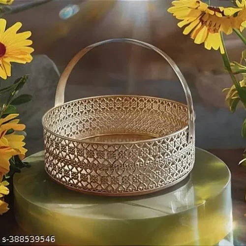 Metal Round Shape Traditional Pooja Basket Dalia, Gold, pooja dalia pooja samagri pooja basket 8X7X8 Inch