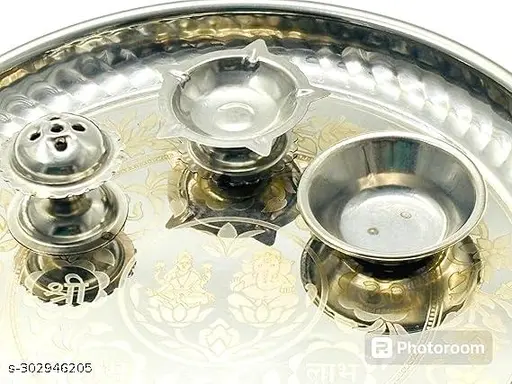 Name : Jelly Stainless Steel Puja Thali Set with Attached Diya, Watti, Agarbatti Stand- Pooja Thali for Office/Home/Temple .(size 10 inch)